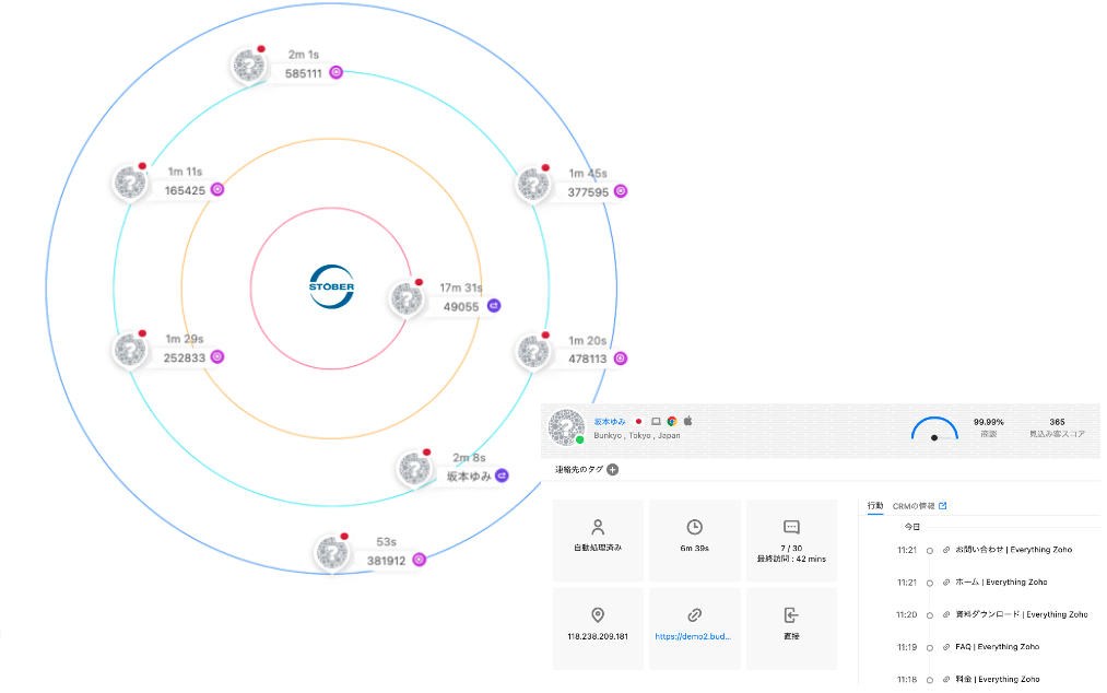 今回の取り組みでは、新たにZoho SalesIQを導入しました。これにより、「誰がいつWebサイトを訪れ、どのページをどれくらい閲覧したか」といった情報をリアルタイムで把握でき、顧客の行動や関心の傾向が可視化されました。