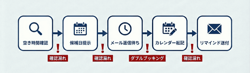 予約業務のボトルネックは、担当者個人の工夫や努力だけでは解決しにくい点もあります。たとえば、空き状況の確認に時間がかかる、候補日の提示と返信待ちが繰り返されて調整が長引く、予約内容の転記がミスや二重予約の原因になる、リマインド漏れで当日の行き違いが起きる、担当者ごとに運用がばらついて属人化する、といった課題が代表例です。