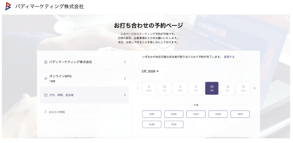 このページのURLを共有するだけで、予約を行うユーザー側が該当ページから空き枠を確認し、希望日時を選んでそのまま予約を進めることが可能です。候補日の提示や返信待ちといった往復が減るため、予約確定までのスピードが上がり、調整工数の削減につながります。