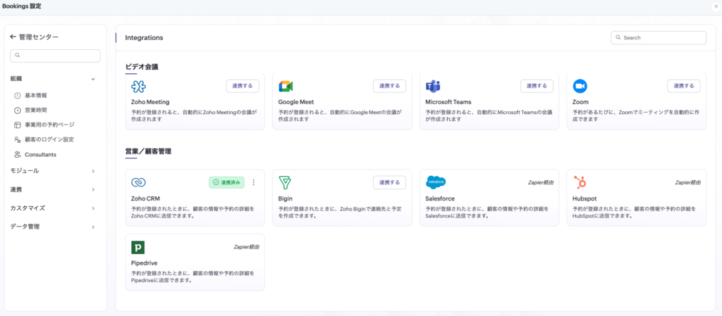Zoho Bookingsは、Zoom、Google Meet、Microsoft Teamsなどのオンライン会議ツールと連携でき、予約確定と同時に会議URLの発行や招待設定までを自動化できます。これにより、面談における「予約→案内→当日参加」までの導線を一本化でき、手作業による設定漏れや案内ミスを防ぎやすくなります。