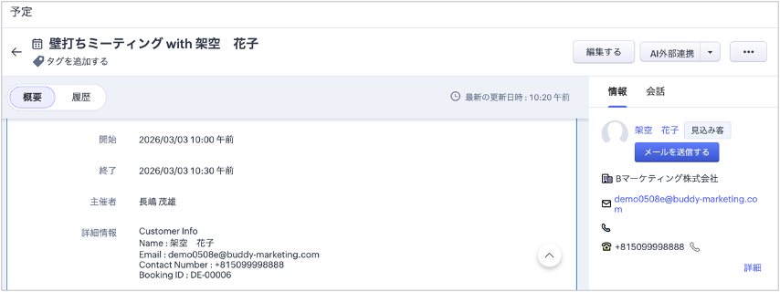 Zoho CRMと連携することで、予約情報を顧客データに紐づけて蓄積することも可能です。予約を起点に、リード、取引先、商談の情報と履歴を一元管理しやすくなり、担当者間の引き継ぎやフォローの抜け漏れを防ぎながら、次アクションの精度向上につなげられます。