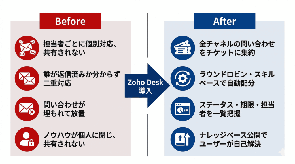 「誰かが返しているだろう」と全員が思ったまま放置され、翌日に顧客から催促が届く。同じ問い合わせに2人が別々の返信を送ってしまう。半年かけて積み上げたやり取りが、担当者の退職とともにメールフォルダごと消える。同じ質問に毎回一から回答する時間もかさんでいく。