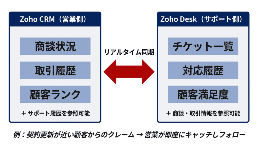 ZendeskやFreshdeskでもZoho CRMとAPI連携は可能ですが、設定のみで双方向のデータ参照がリアルタイムに動く点は、ネイティブ統合ならではです。