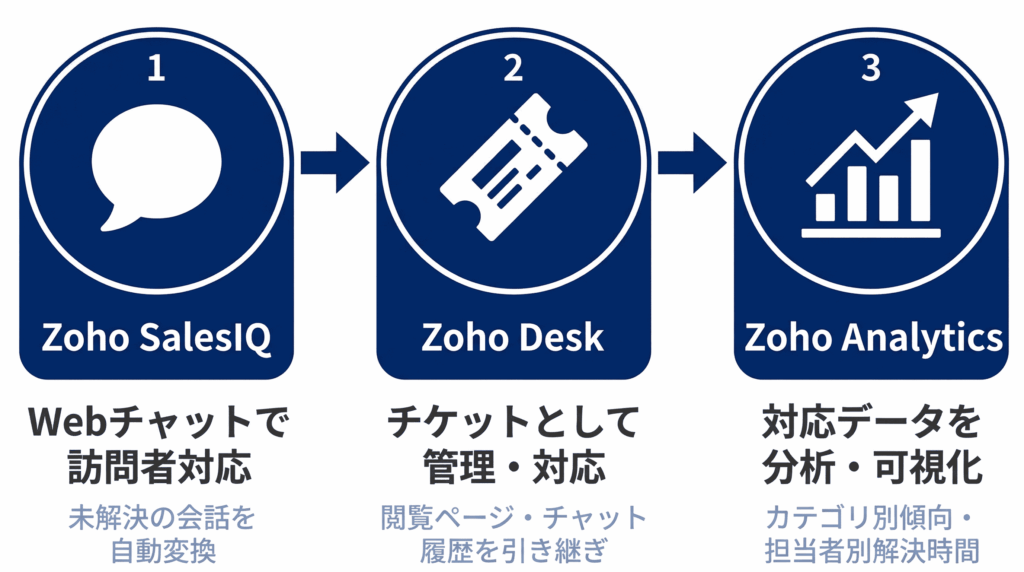 「チャット(SalesIQ)→ チケット(Desk)→ 分析(Analytics)」の流れがエコシステム内で完結するため、Zoho製品を中心にバックオフィスを組んでいる企業にとっては、この一体感が大きな決め手になります。