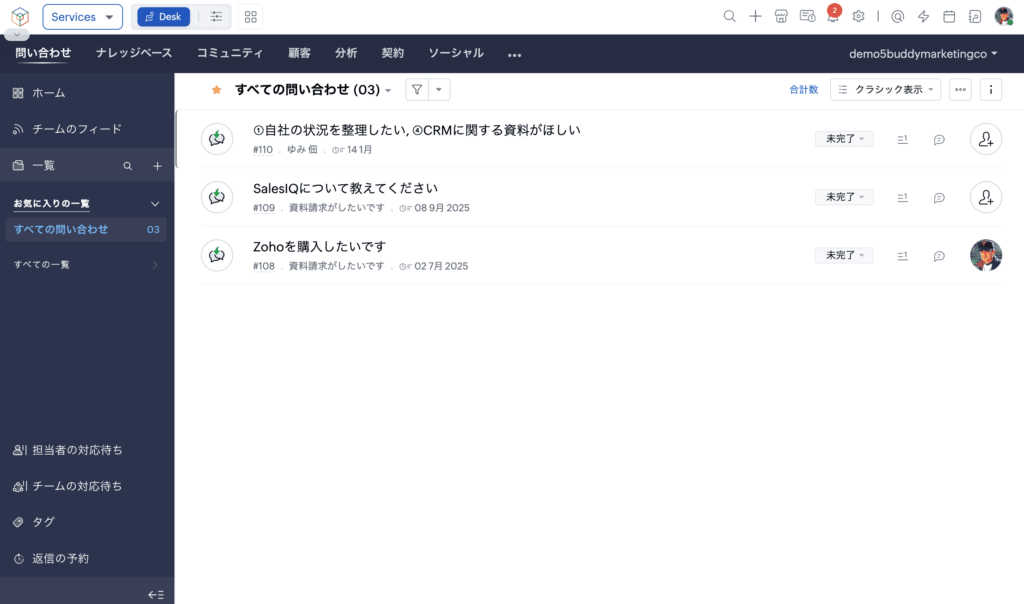 Zoho Deskの大きな特徴の1つは、Zoho CRMとのネイティブな双方向データ連携です。サポート担当者がチケット画面を開くと、その顧客のCRM上の商談状況・過去の取引履歴がそのまま表示されます。逆に、営業担当者はCRMの画面から顧客のサポート履歴を参照可能です。