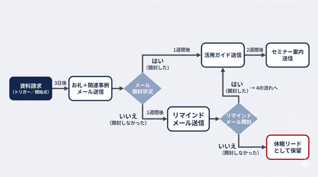 資料請求をトリガーに、3日後にお礼+関連事例メール → 1週間後に活用ガイド → 2週間後にセミナー案内。最もシンプルで、最初に組むジャーニーとして適しています。