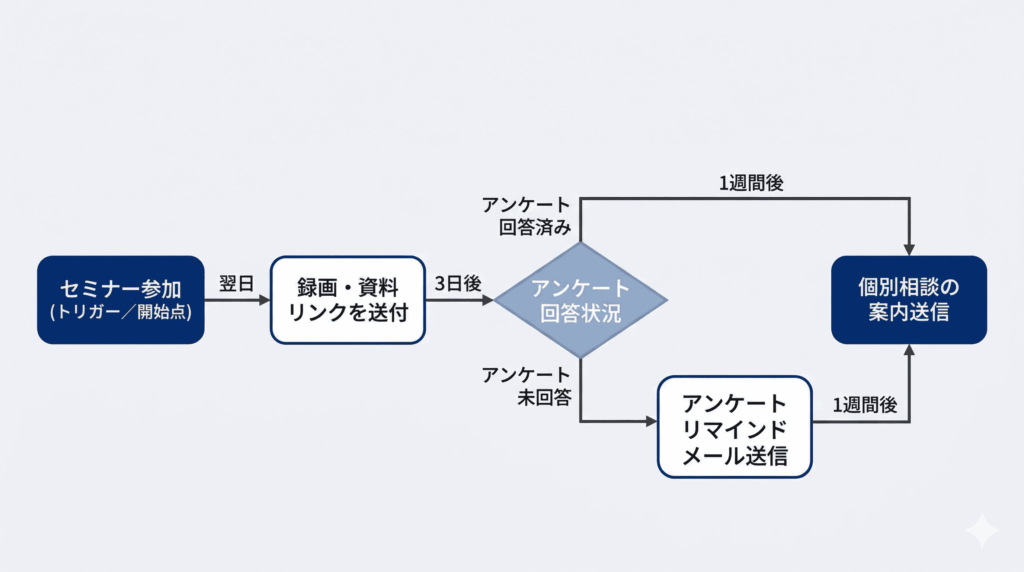 セミナー参加者に、翌日に録画・資料のリンクを送付 → 3日後にアンケート未回答者にリマインド → 1週間後に個別相談の案内。セミナー後のフォローは手動だと抜け漏れが出やすいため、自動化の効果が出やすい場面です。