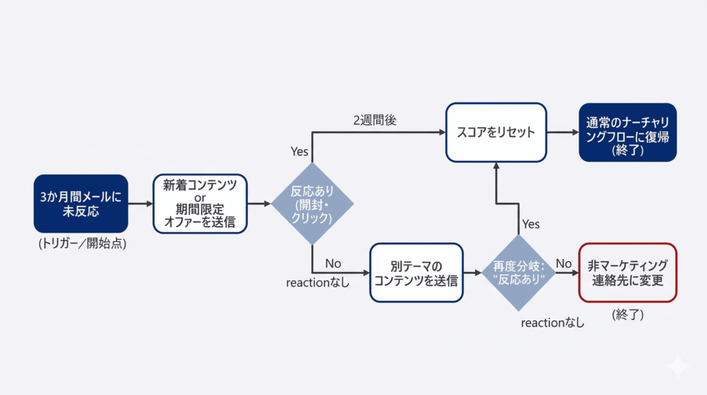 一定期間(3か月など)メールに反応がないリードに対して、新着コンテンツや期間限定のオファーを送り、反応があればスコアをリセットして通常のナーチャリングフローに戻す。放置したままのリードをもう一度動かすのに使えます。