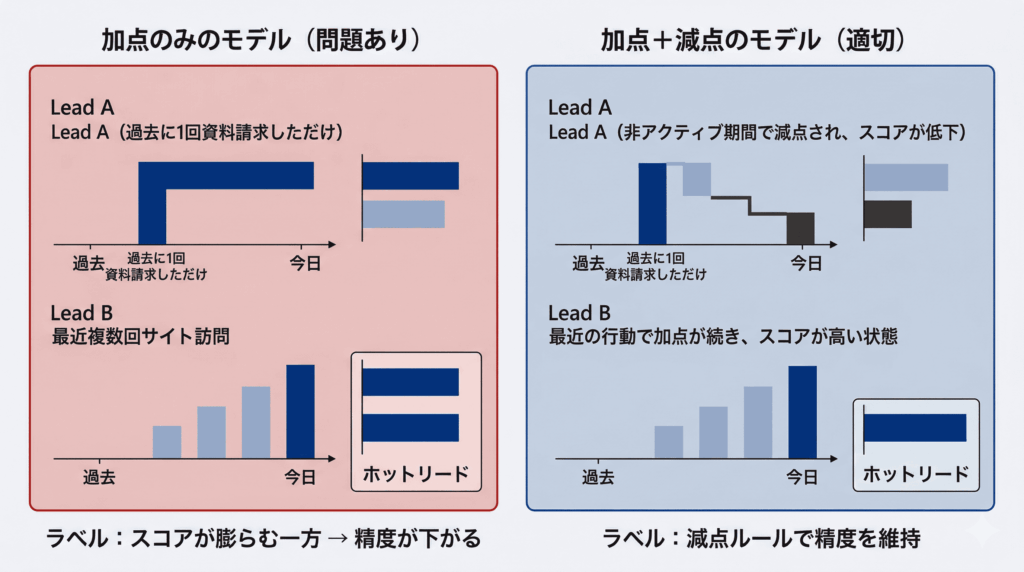 見落とされがちなのが「減点」の設計です。メールを一定期間開封しない、Webサイトへのアクセスが途絶えるなどの非アクティブ状態に対して減点ルールを設けておかないと、過去に一度だけ資料請求した人がいつまでもスコア上位に残り続けます。加点だけのモデルではスコアが膨らむ一方になり、「ホットリード」の精度が下がる原因になります。
