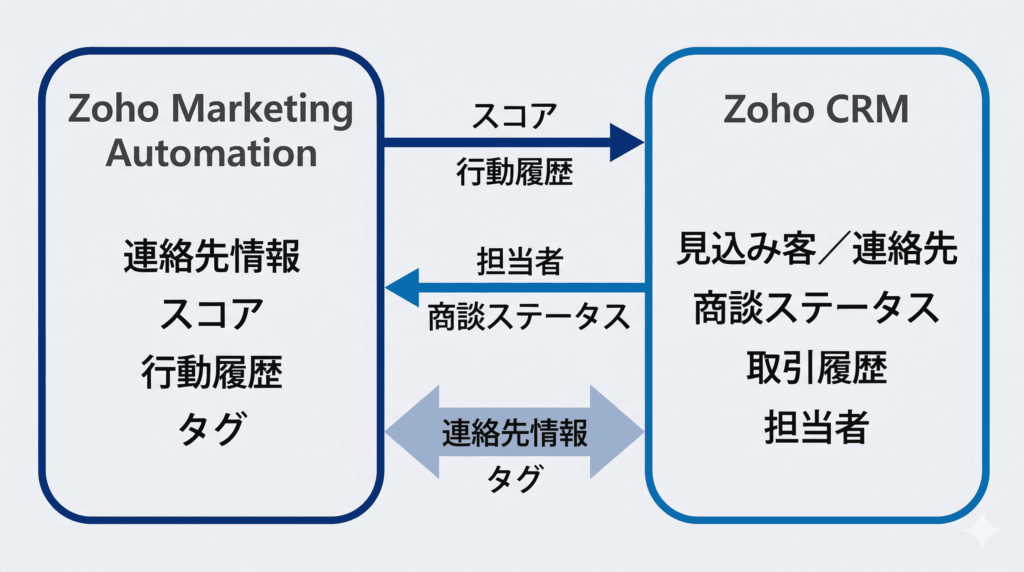 Zoho CRMを使っている企業にとって、Zoho Marketing Automationとの連携はプランの標準機能に含まれており、追加のプラグインやAPI開発なしで設定できます。MA側でスコアが閾値を超えたリードをCRMの営業パイプラインに自動で送り、CRM側のワークフロー機能と組み合わせることで営業担当の割り当てまで自動化できます。