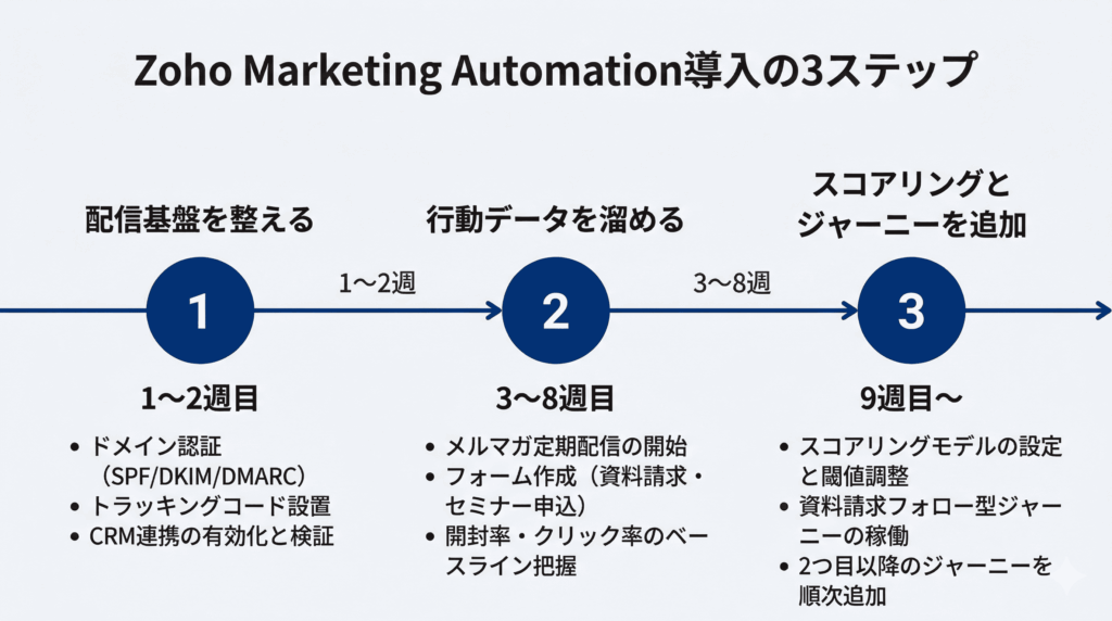 MAツールは契約してすぐに成果が出るものではありません。兼任担当者が無理なく立ち上げるための進め方を、3つのステップに分けて整理します。