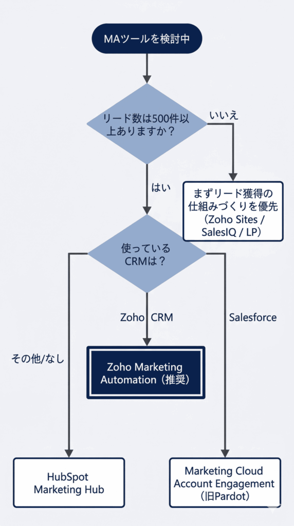 当社の導入支援経験では、リード数が500件に満たない段階ではMAの導入よりもリード獲得の仕組みづくりを優先したほうが成果につながりやすい傾向があります。Zoho Forms、SalesIQ(チャットボット)、LandingPage(LP作成ツール)でリードの母数を溜め、スコアリングが意味を持つ規模になってからMAを本格的に取り入れるステップが妥当です。
