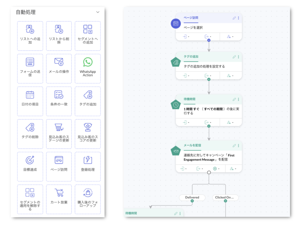 | ジャーニービルダー | 見込み客ごとに異なるシナリオを設計し、メール・SMS・WhatsAppなど複数チャネルをまたいだ育成フローを自動実行 |