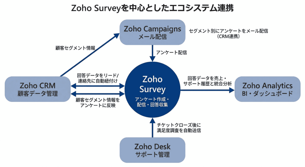 連携先はCRMだけではありません。Zoho Campaignsと組み合わせれば、CRMのセグメント(「過去1年以内に購入した顧客」など)に対してアンケートをメール配信し、回答結果を再びCRMに戻せます。Zoho DeskやZoho Analyticsとも連携でき、サポート対応後の満足度調査の自動送信や、アンケート結果を売上データと掛け合わせたダッシュボード構築にもつなげられます。