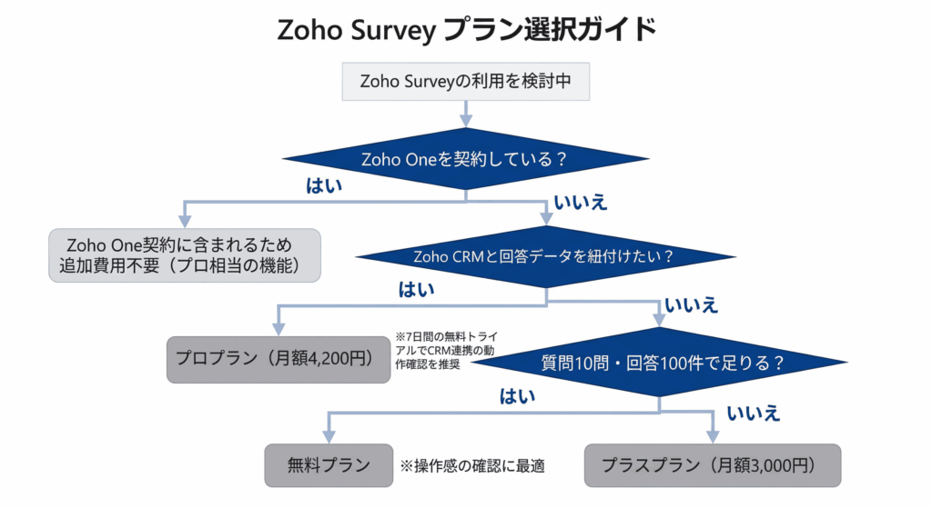 実務上の判断ポイントは「CRM連携が必要かどうか」です。Zoho CRMと回答データを紐付けて分析したいなら、プロプラン以上が必須になります。月額の差は1,200円ですが、CRM連携の有無で得られる分析の深さはまったく変わります。Zoho CRMを使っている企業がプラスを選ぶ理由はほぼありません。